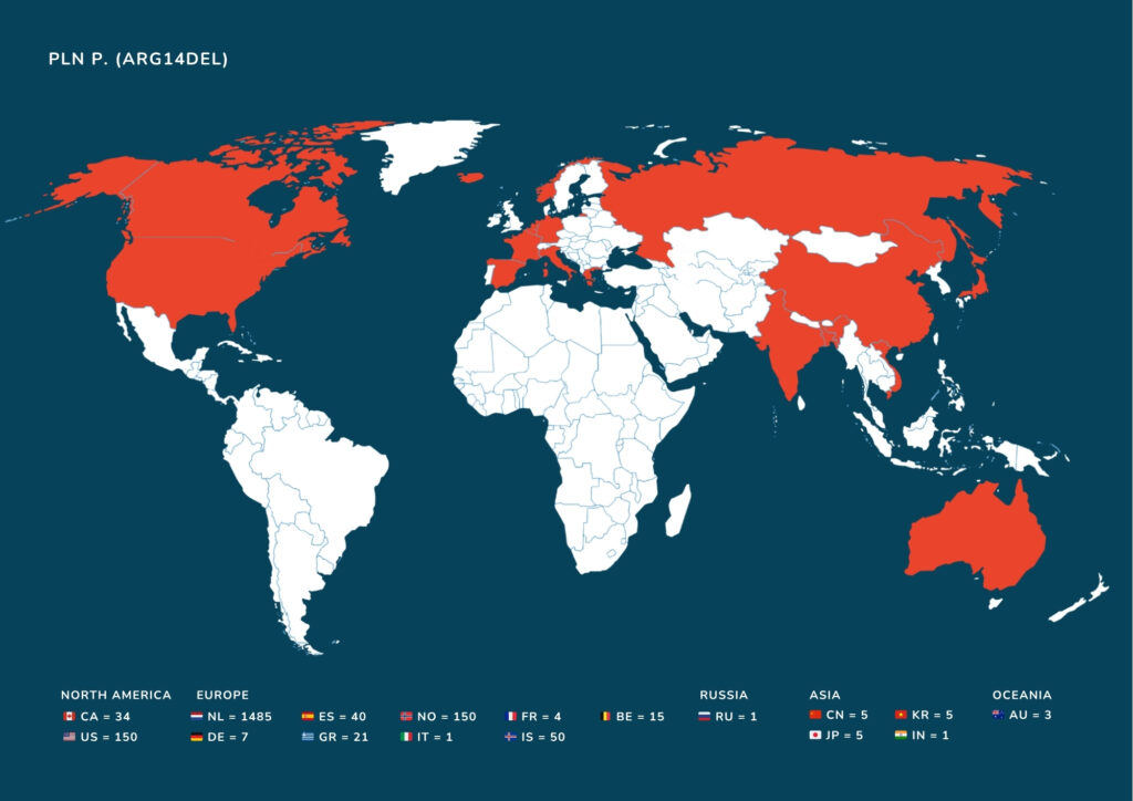 PLN-R14del is een Nederlandse ziekte. Ergens tussen 1200 en 1400 is er een mutatie op het PLN-gen ontstaan, waardoor de PLN-mutatie zich heeft verspreid. Dit is gebeurd in Friesland. Alle PLN-dragers stammen dus af van deze Friese voorouder. Door de jaren heen zijn Nederlanders zich over de wereld gaan verspreiden vanwege migratie. Hierdoor heeft de PLN-mutatie zich ook verspreid over de hele wereld.